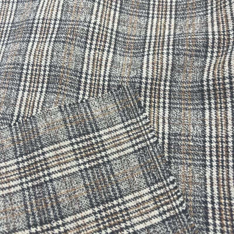 250515 maddesi olarak tanımlanan bu kumaş, %20 yün, %75 polyester ve %5 spandeksten oluşan dokuma bir tekstildir. Birim alan başına 450g/m kütlesi ile takım elbiseye uygun orta ağırlıkta bir yapı sunar. Kumaş, görsel kontrast için metalik iplik elemanları içeren, kahverengi renkte entegre ekose ve kazayağı desenine sahiptir. Spandeksin eklenmesi yaklaşık %20-25 yatay esneme kapasitesi sağlarken, yün ve polyester karışımı yapısal stabiliteyi korur. Elyaf bileşimi ve dokuma tekniğinin bu kombinasyonu, tanımlanmış esnekliğe ve desen tanımına sahip bir kumaş oluşturarak, hem hareket kabiliyeti hem de estetik detay gerektiren çağdaş, kişiye özel giysiler için uygulanabilir hale getiriyor.