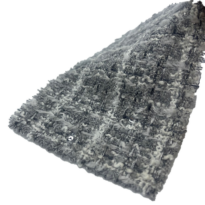 23503 maddesi olarak tanımlanan bu kumaş %49 akrilik, %40 polyester, %7 yün ve %4 naylondan oluşan tüvit bir tekstildir. Birim alan başına 335 gsm'lik kütle ile hafif ancak yapılandırılmış bir yapı sunar. Yüzey, kumaş üzerinde zarif bir yükseltilmiş doku oluşturan kabartma işlemiyle elde edilen ince gri ekose desenine sahiptir. Bu teknik, dokuma tabanı değiştirmeden ekosenin görsel derinliğini artırır. Çoklu elyaf karışımı, polyesterin sağlamlığını, akriliğin esnekliğini, yünün doğal dokunuşunu ve naylonun dayanıklılığını birleştirir. Bu özellikler, kumaşı, ayrıntılı desenlendirme ve dokunsal ilginin gerekli olduğu kadın giysileri için uygun kılar.