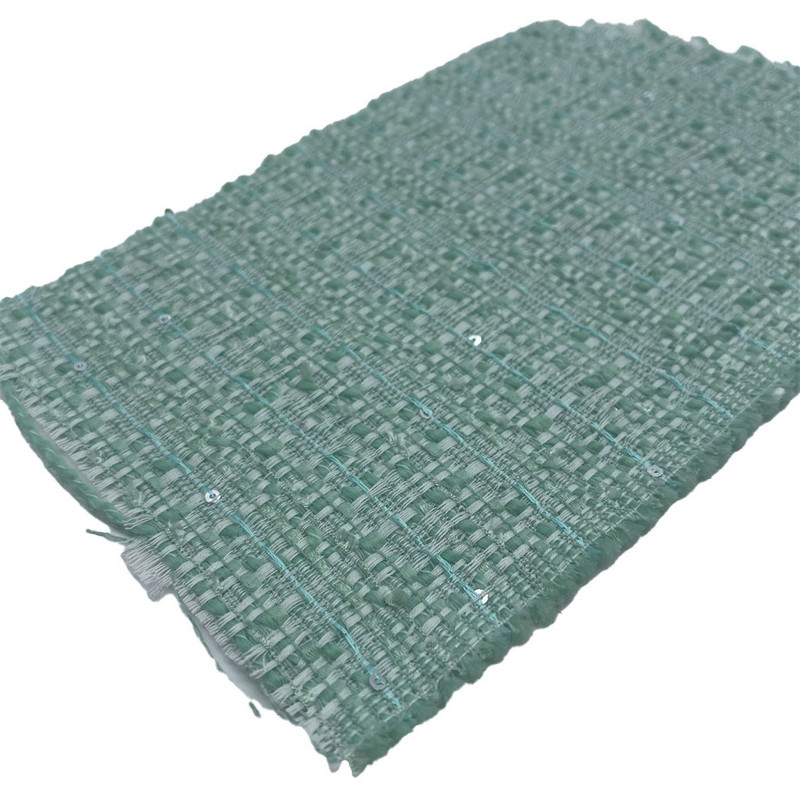 22102 maddesi olarak tanımlanan bu kumaş, %90 polyester ve %10 yünden oluşan jakarlı tüvit bir tekstildir. Birim alan başına 320 gsm kütlesi ile elbiselere uygun hafif bir yapı sunar. Açık yeşil taban, yerelleştirilmiş yansıtıcı alanlar oluşturmak için dokuma işlemi sırasında payetlerin entegre edildiği kabartmalı bir jakar desenine sahiptir. Yüksek polyester içeriği boyutsal stabilite ve şeklin korunmasını sağlarken, yün bileşeni kumaşın dokunsal özelliklerine katkıda bulunur. Bu kombinasyon, yüzey dokusu çeşitliliğine ve yapısal tutarlılığa sahip bir malzemeyle sonuçlanır. Bu teknik özellikler, bu jakarlı tüvitin, dekoratif yüzey ilgisi ve giysi yapısının gerekli olduğu elbiseler için uygun olmasını sağlar.