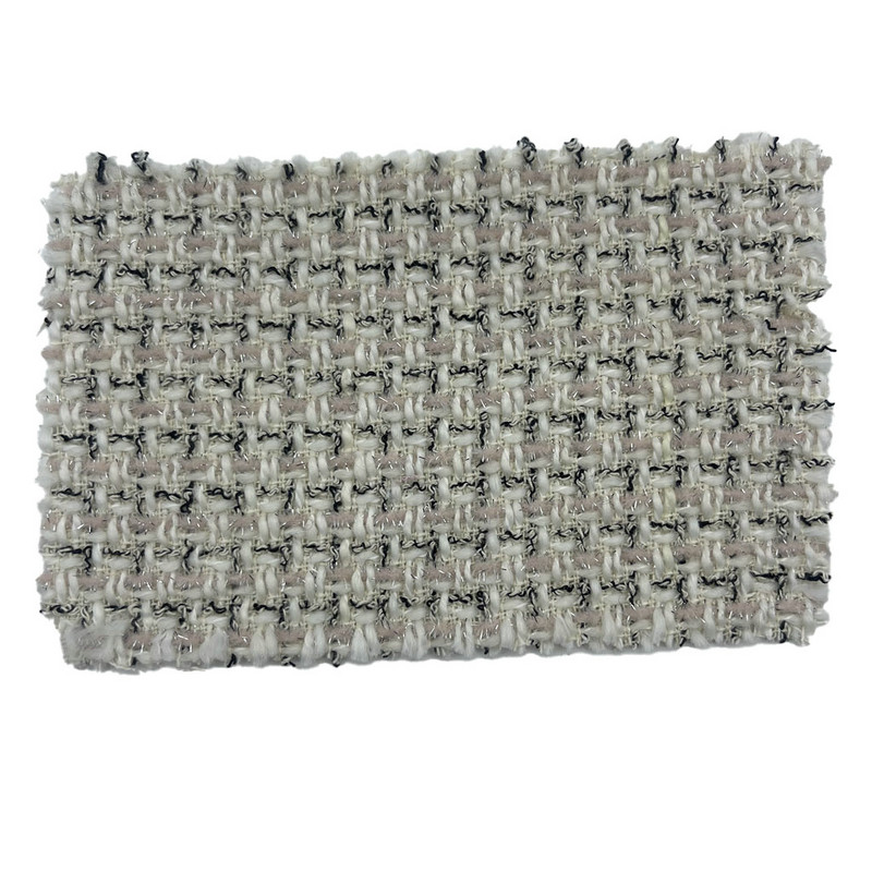 23523 maddesi olarak tanımlanan bu kumaş %78 polyester, %12 yün ve %10 pamuktan oluşan tüvit bir tekstildir. Birim alan başına 440 gsm kütlesi ile elbiselere uygun orta ağırlıkta bir yapı sunar. Açık pembe taban, dokuma işlemi sırasında metalik iplikle entegre edilmiş kareli bir desene sahiptir. Bu kombinasyon hem görsel görünümde hem de ışık yansımasında kontrast oluşturur. Polyester, yün ve pamuk karışımı kumaşın boyutsal stabilitesine, termal düzenlemeye ve nem yönetimine katkıda bulunur. Bu teknik özellikler, bu tüvitin, desen tanımı ve malzeme performansının gerekli olduğu moda elbiseler için uygulanabilir olmasını sağlar.