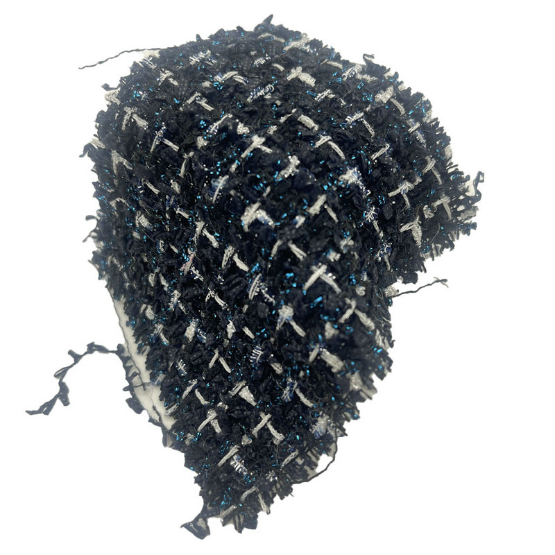 23511 maddesi olarak tanımlanan bu kumaş, %86 polyester ve %14 naylondan oluşan kareli tüvit bir tekstildir. Birim alan başına düşen 340 gsm kütlesiyle hafif bir yapı sunar. Koyu mavi taban, ekose deseni içinde mavi metalik bir iplik içeriyor ve değişen ışık yansımasıyla kontrast oluşturan bir görsel etki yaratıyor. Polyester-naylon karışımı boyutsal stabilite ve yapısal tutarlılık sağlar. Metalik elemanların dahil edilmesi, dokuma yüzeye ışık etkileşimli özellikler katar. Bu teknik özellikler, bu tüvit kumaşın, tanımlanmış desen eklemlenmesi ve ince yüzey değişikliklerinin gerekli olduğu kadın giyiminde uygulanabilir olmasını sağlar.