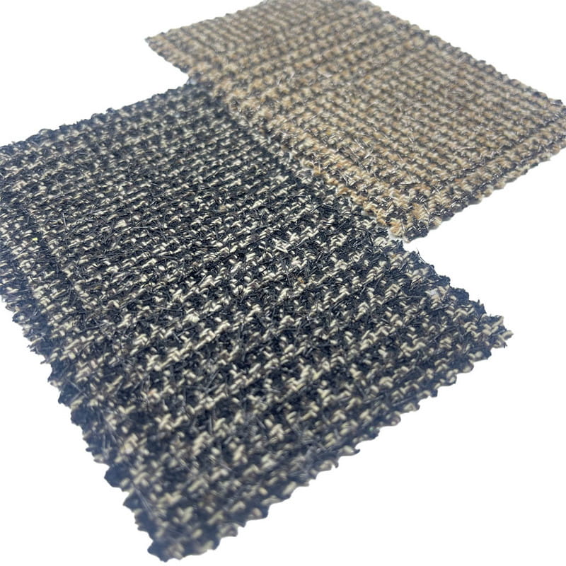 4336 maddesi olarak tanımlanan bu kumaş, %5 yün ve %95 diğer elyaflardan oluşan bir tüvit tekstilidir. Birim alan başına 550 g/m2'lik kütlesiyle ağır bir yapı sunar. Siyah ve kahverengi yüzey, dokuma işlemi sırasında metalik iplikle bütünleştirilen kareli deseni kazayağı motifiyle birleştiriyor. Bu teknik, geometrik desenlerin ışığı yansıtan öğelerle vurgulandığı kompozit bir tasarım oluşturur. Metalik ipliğin dahil edilmesi, dokuma tabana karşı kontrast oluşturan görsel efektler sunar. Teknik özellikler, çok katmanlı görsel karmaşıklığa ve yapısal yoğunluğa sahip bir malzemeyle sonuçlanır ve bu da onu desen artikülasyonunun ve yüzey varyasyonunun gerekli olduğu projeler için uygulanabilir kılar.