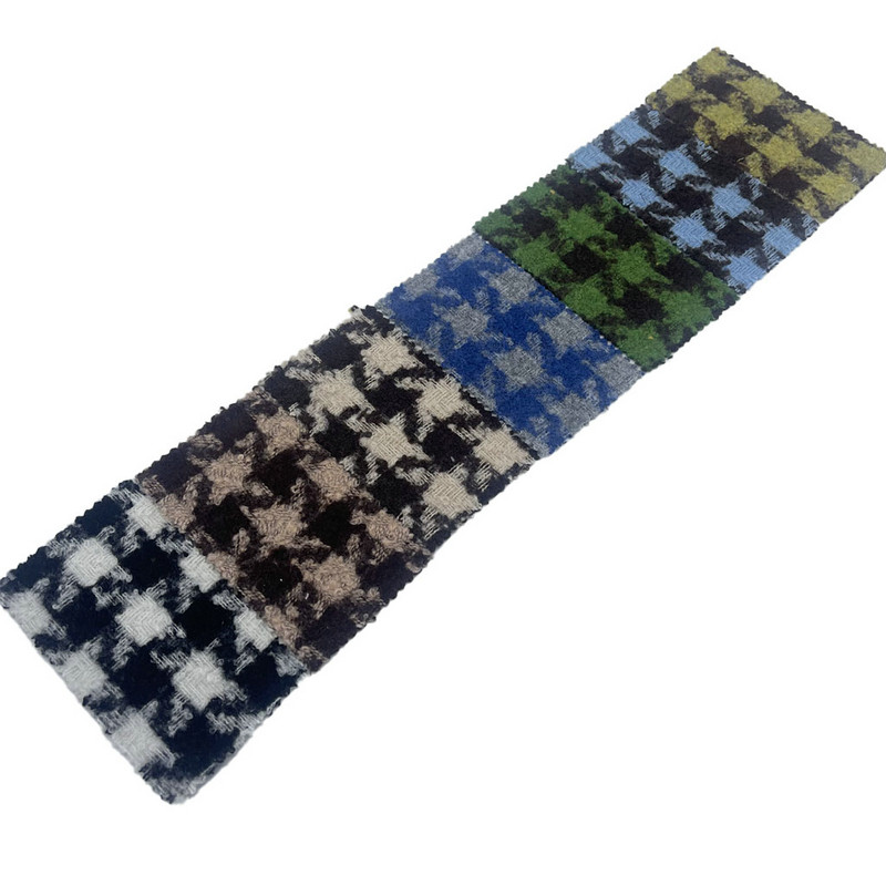 2882 maddesi olarak tanımlanan bu kumaş, %10 yün ve %90 diğer elyaflardan oluşan jakarlı tüvit bir tekstildir. Birim alan başına 600 g/m2'lik kütlesiyle ağır bir yapı sunar. Yüzey, jakarlı dokuma işlemi yoluyla kazayağı desenini ekose öğelerle birleştirir. Yoğun, kısa tüylü bir yüzey oluşturan, yükseltilmiş oyuncak benzeri bir doku oluşturmak için fırçalama cilası uygulandı. Bu teknik, dokuma desenlerin geometrik hassasiyetini korurken kumaşın hem görsel derinliğini hem de dokunsal özelliklerini değiştirir. Yün karışımı bileşimi malzemenin esnekliğine ve ısı yalıtımına katkıda bulunur. Bu teknik özellikler, bu kumaşın hem karmaşık desen tanımı hem de farklı yüzey dokusu gerektiren projeler için uygulanabilir olmasını sağlar.
